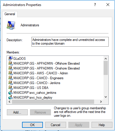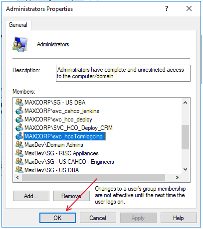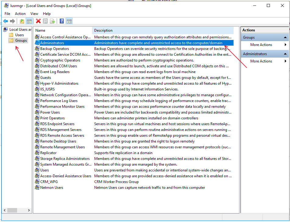 Click Groups on the left panel, Choose Administrators to Open Administrators Peoperties Window: