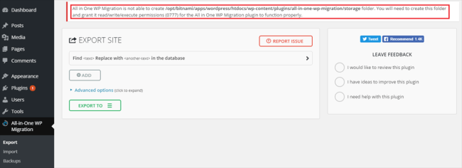In “All-in-One WP Migration”, I need to make a “../storage” directory manually because the plugin tries to make a directory and store backup, but it fails to make a directory.