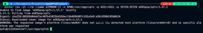- The article above states the command to run the docker as per Mac. You can take the command from this article on Windows/Linux. https://hub.docker.com/r/m365pnp/spfx