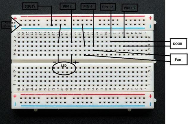 - According to the program, I have used pin 2 of the Arduino for light, pin 4 for the fan, and pin 12, 13 for the door.