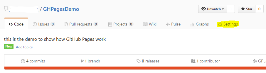 Second, you need to do settings in your repository that from which branch your website should be rendered. For doing that, select your repository in GitHub. On the top right, you will see a "settings" link (just below the repository name).