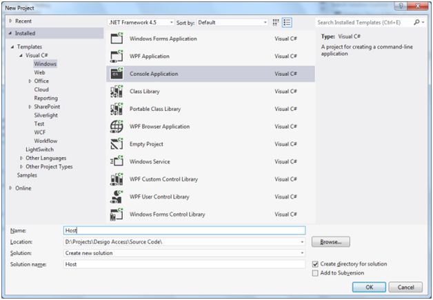 In the First step, you can find out that New Host Project will be created. For the Demonstration purpose ,i have selected the console application in windows templates. you can also select the Host project as Windows Form application or WPF application. The following snapshot provides a clear picture on first step.