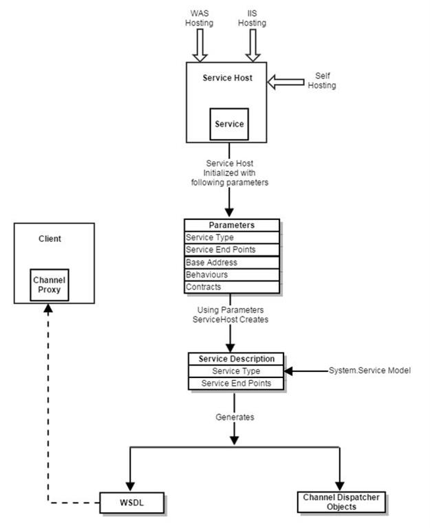 Service Host is a part of System.ServiceModel Namespace. ServiceHost instance associates one or more services to be accessible at run- time. When you are trying to do hosting in a console application(self-hosting), then you need to use the class Service Host. If you are trying to host your service in WAS or IIS, WAS or IIS will use the instance ServiceHost on behalf of you. ServiceHost will be initialized with the parameters ServiceType,Service EndPoints,Base Address and Behaviour and creates a service description that is a part of System.ServiceModel. The ServiceDescription is responsible for creating the description of the service that includes the types of service,endpoint and behaviors, and uses that description to create the channel dispatcher objects and WSDL document so that the client can access the exposed services. The following diagram shows the process of service host.