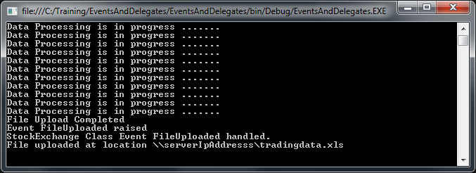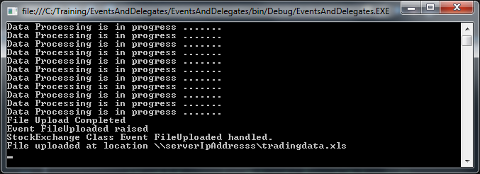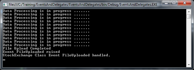 If we look at the implementation of the above class StockExchange, we have declared an event named FileUploaded that is raised when file upload is completed. As we can see that the .NET framework in-built delegate publicdelegatevoidEventHandler(object sender, EventArgs e) is associated with the event, a method with similar signature as delegate can be declared and assigned to the event.