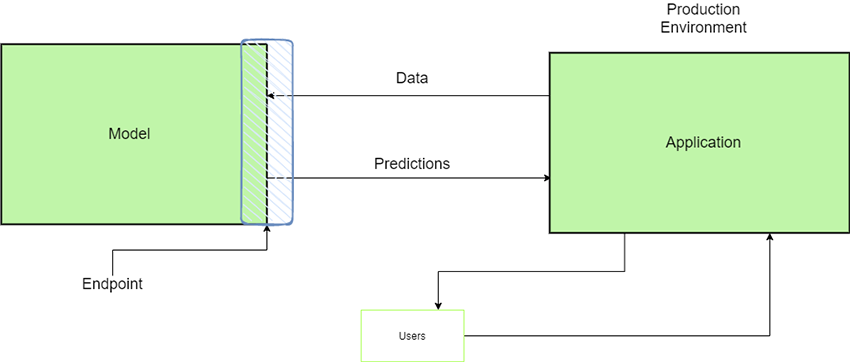 From the above example, we can realize that the application similar to the python program itself, displays the prediction of the model to the application user. This will be enabled by the communication channel or interface of the endpoint – here, the function call which accepts the user data as the input and then returns the prediction of the model which is completely based upon this input accessed through the endpoint. Here, the input argument is the user data and the returned value from the function call is the prediction from the model.