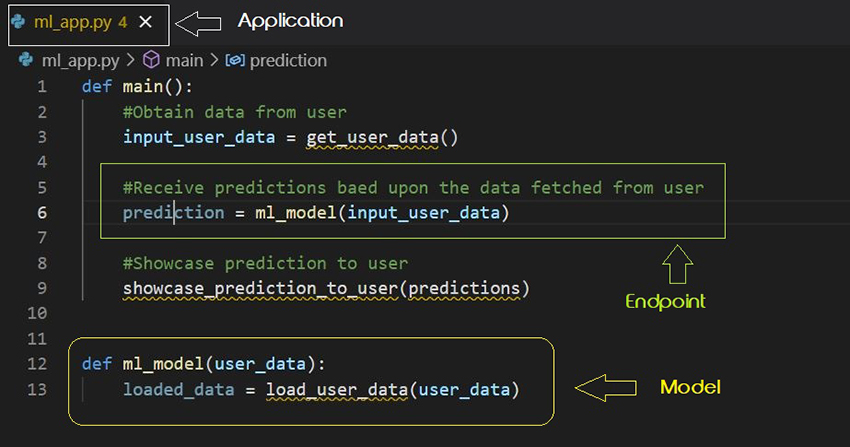 To understand this with a program, let us consider ml_app.py which is a python program. In this program, the endpoint is similar to the function call that helps connect model and application whereas the function itself is a model which performs training and evaluation. The entire program ml_app.py represents the application. The description association of the elements of the sample program to model, application, and endpoint can be seen below.