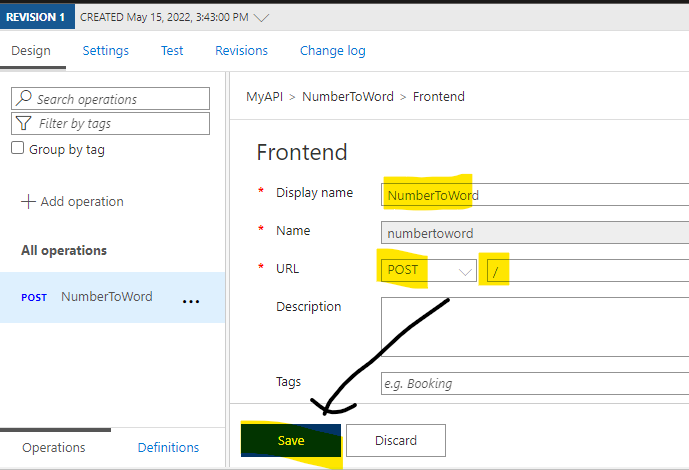 Now you can see the POST operation created under all operations, all operation is nothing but the entry point of the API call. So, let’s understand the flow of API when you call the API. API can have one or multiple operations, here MyAPI has one operation NumberToWord. When you call this operation, the Front end request goes through the All operations-> Inbound Process-> call backend service->Response back to outbound processing-> show to the end user(front end)