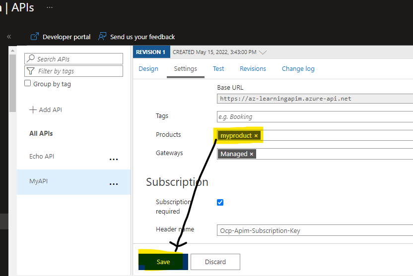 Now you can see MyAPI is created, we will go to settings and will add the myproduct that we have created in the first step and click on the save button.