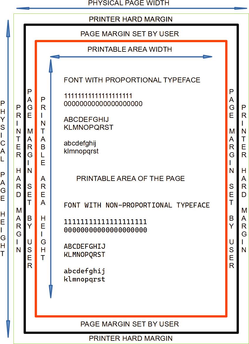 Typeface proportion is directly correlated to the size of letters. There are two typefaces when proportion is in question, Proportional and Non-Proportional. Letter height for any typeface proportion is the same. Letter width differs. Width of characters is the same for Non-Proportional typeface, font with this typeface is also known as mono-spaced or fixed width font. Width of letters for proportional typeface is variable. So when we select font, with non-proportional typeface, we can calculate exact number of letters that can fit across page printable area height and width. But when we select font, with proportional typeface, we can calculate exact number of letters that can fit across height of page, or number of rows, but there is no exact method for calculating how many letters can fit across page printable area width, except printing letter by letter of text, and counting number of letters that fit in from left to the right margin of page. Most important, if there is need to print aligned text in columns, we need to use font with non-proportional typeface, so that letters get vertically aligned.