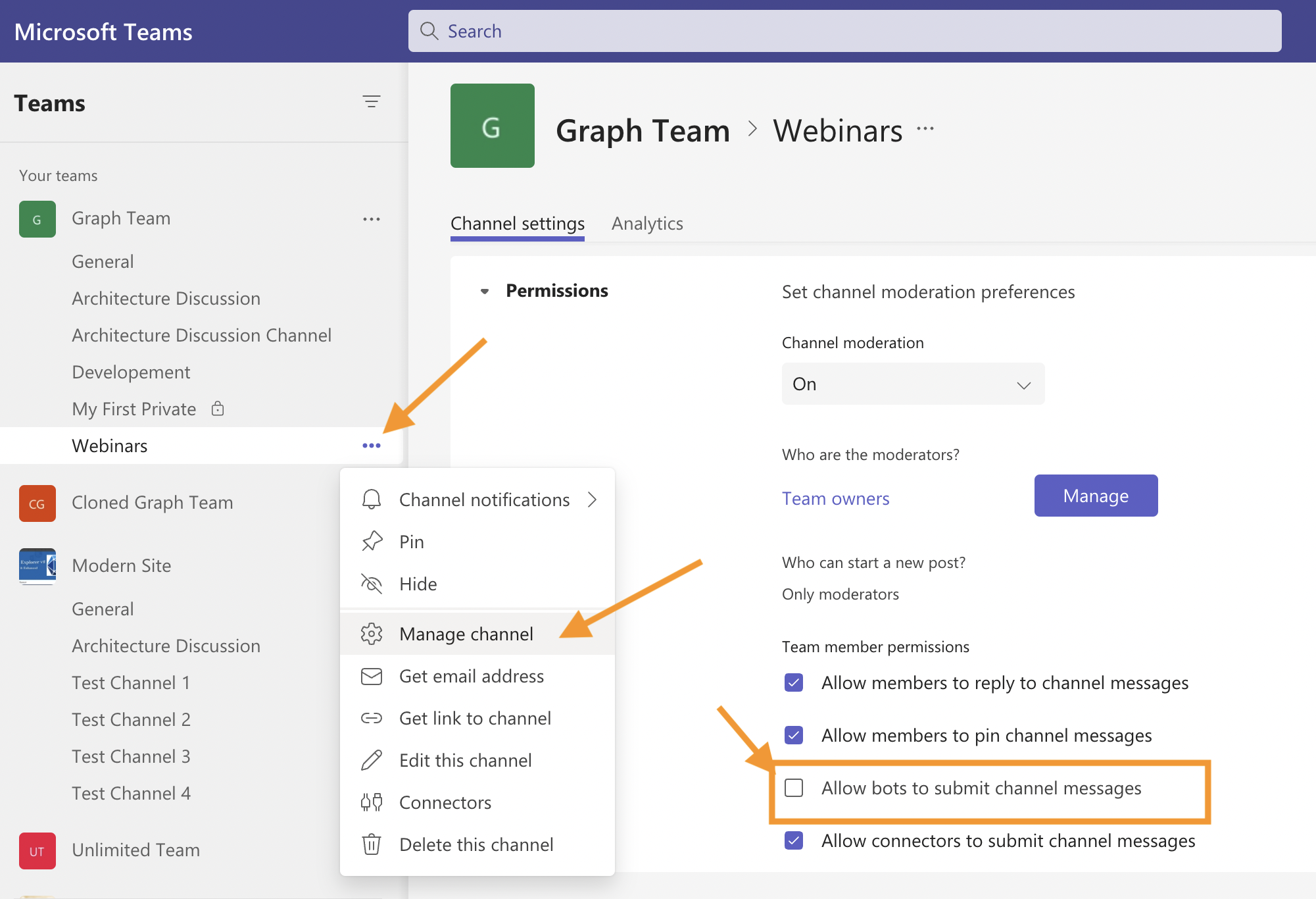 We can also use the Microsoft Graph API to do the same action. Use the below options in Microsoft Graph Explorer to change the moderation settings to avoid bots posting messages in the channel.