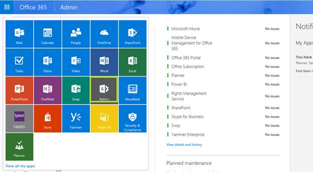 Then, on the App launcher, click on “Admin”, which will take you to the Admin Dashboard on Office 365, as shown below.