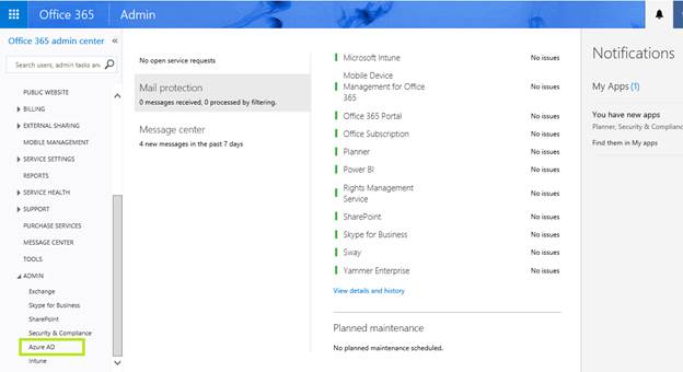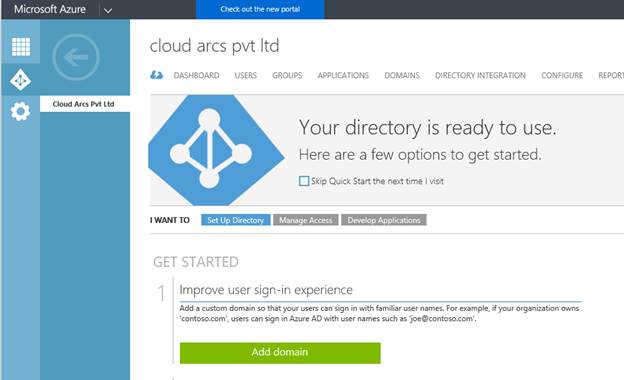 Once on the Admin dashboard, under “Admin”, select “Azure AD”. This will load the Azure Directory Portal related to your Office 365 tenant. If this is the first time you are accessing the Azure AD, it will prompt you to set it up initially. This is a fairly simple process which consists of the following on-screen commands to finalize the setup.