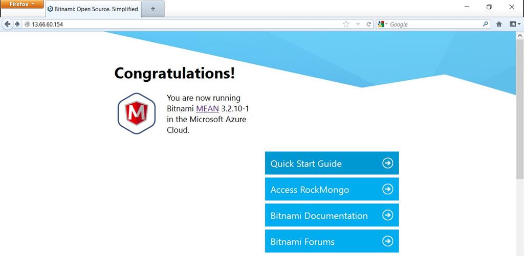 Pre-configured stacks in Azure Marketplace: The Azure Marketplace has many pre-configured Node.js stacks, including Mean.io, Jelastic Hybrid PaaS, and Bitnami MEAN Stack. We can start playing around with these and deploy a fully configured stack on Azure within minutes.