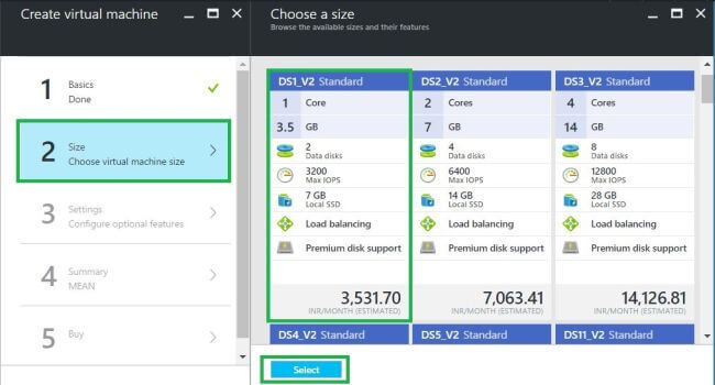 New Create Virtual Machine blade and provide the required following values for configuring our MEAN Stack. Click OK to continue to the next section.