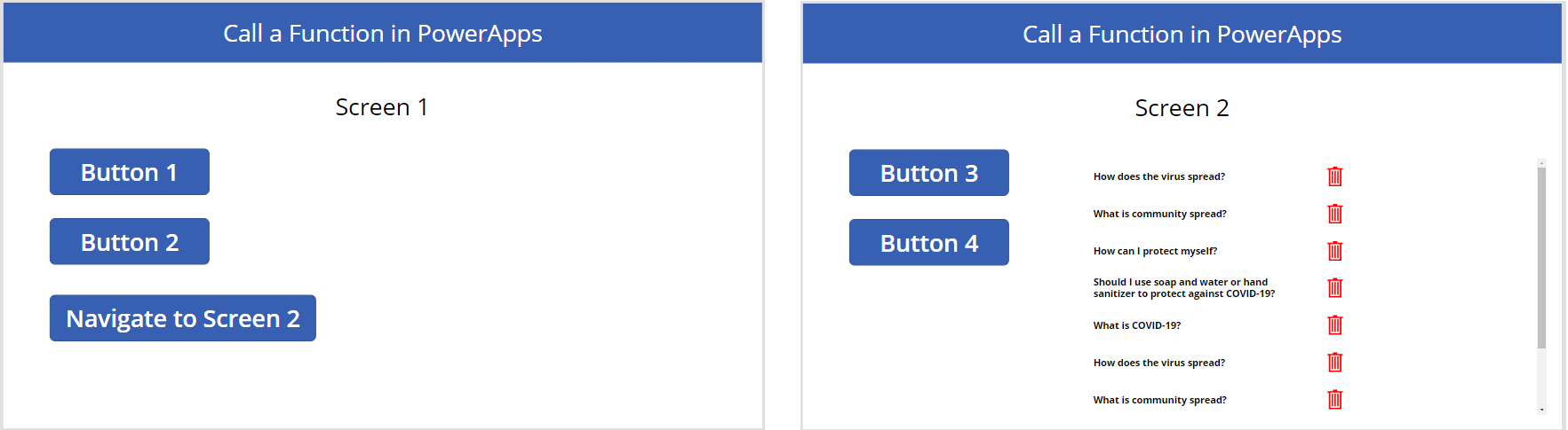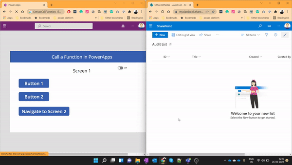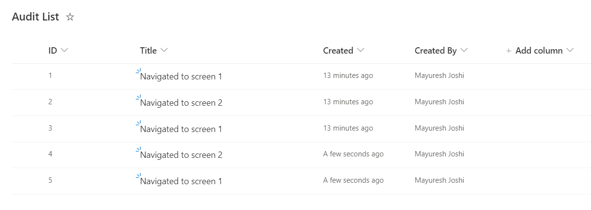 I want to create an audit list that tracks the user activity performed on the canvas app. I have two screens, a few simple buttons, a gallery with the delete button. Whenever the user navigates to these screens or clicks on different buttons, a new list item should get created. To track the activity details, we will also pass a parameter to the function call.