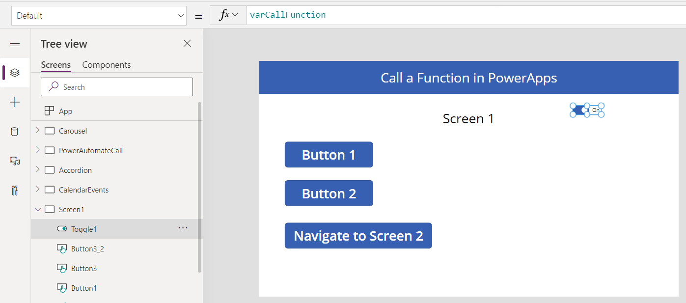 To call a function or formula that we have defined in the OnChange event of the toggle, just invert/toggle the varCallFunction value using !Toggle1.Value. Also, set the parameter value (parameter is nothing but a string variable).