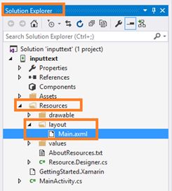 Now, go to Solution Explorer. In Solution Explorer, get all the files and source in your project. Select Resource-->Layout-->double click to open main.axml page. To write XAML code, you need to select the source.
