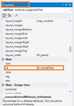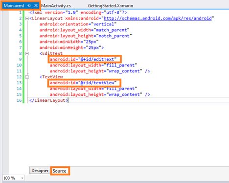 In this step, go to Main.axml page source panel. Note, the EditText Id's value and TextView's Id value.