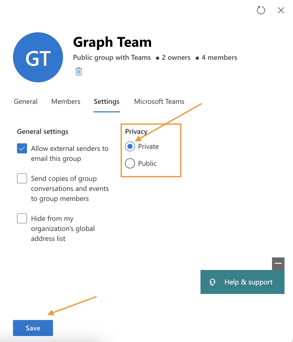 We can also use the Microsoft Graph API to do the same action. Use the below options in Microsoft Graph Explorer to change the visibility settings.