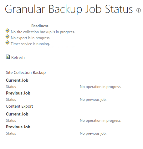 You can have your Granular Backup configured or restored for various purposes, for example, to save a copy or to restore it to another Server. Here, you view the status of Granular Backup job status jobs running on this Central Admin.