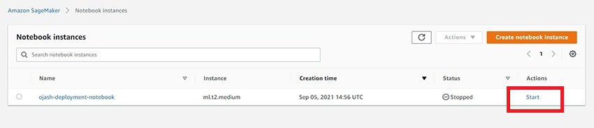 You can easily follow the instructions from the previous article, Creating Notebook Instance in Amazon SageMaker, and have the notebook instance running. We have our notebook instance, ojash-deployment-notebook running.