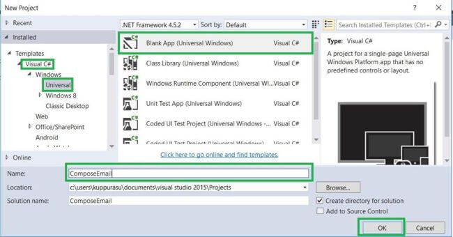 Then, New Project window will open. There, select Installed -> Template -> Visual C# -> Windows -> Universal and select a Blank App (Universal Windows).