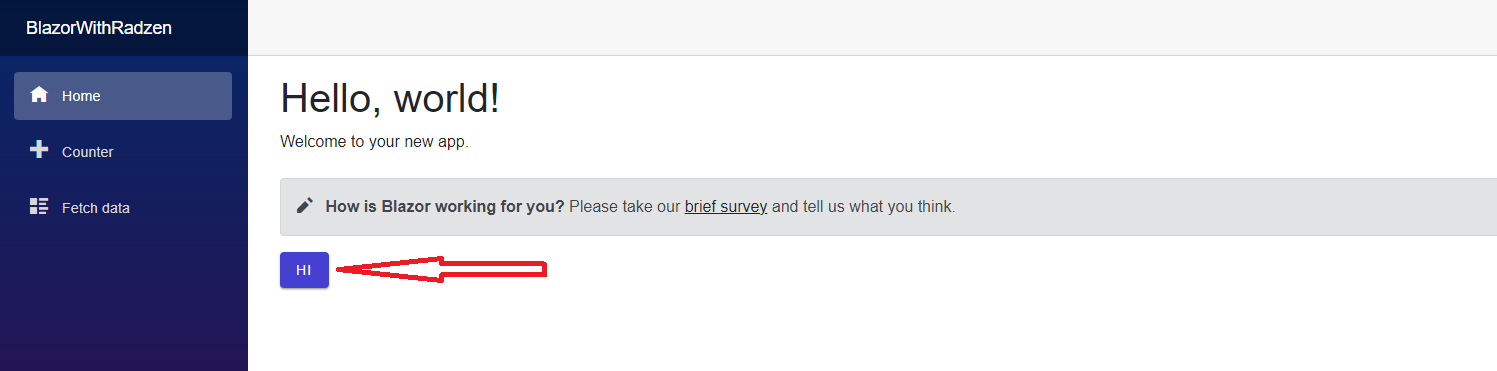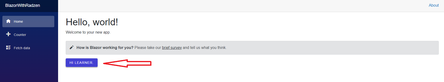 Here we have used RadzenButton and set its text with a variable text and when we click on the button the text of the button change to Hi learner.