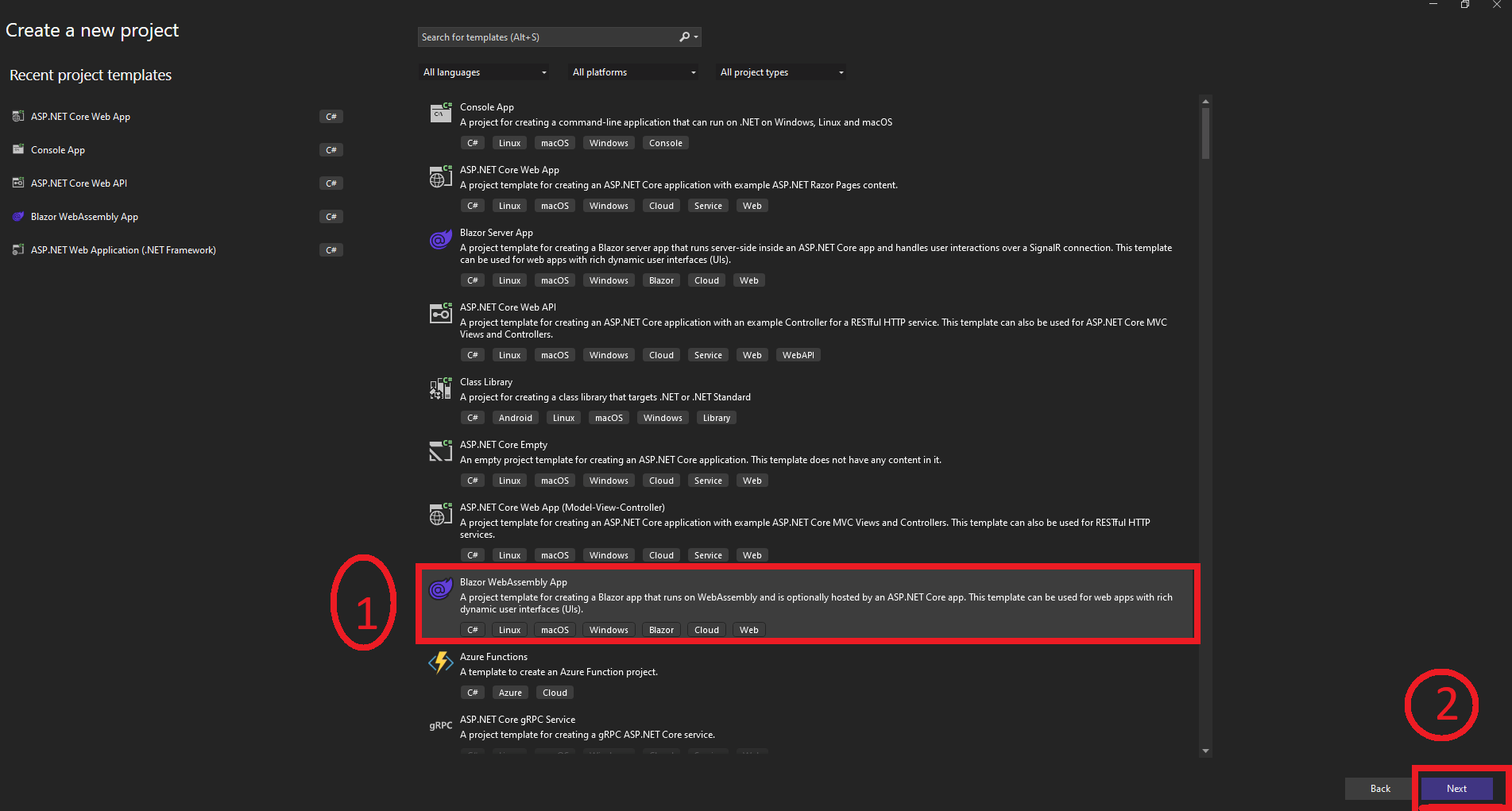 Now we need to choose the project type and template, here I am choosing Blazor WebAsembly App and clicking on next