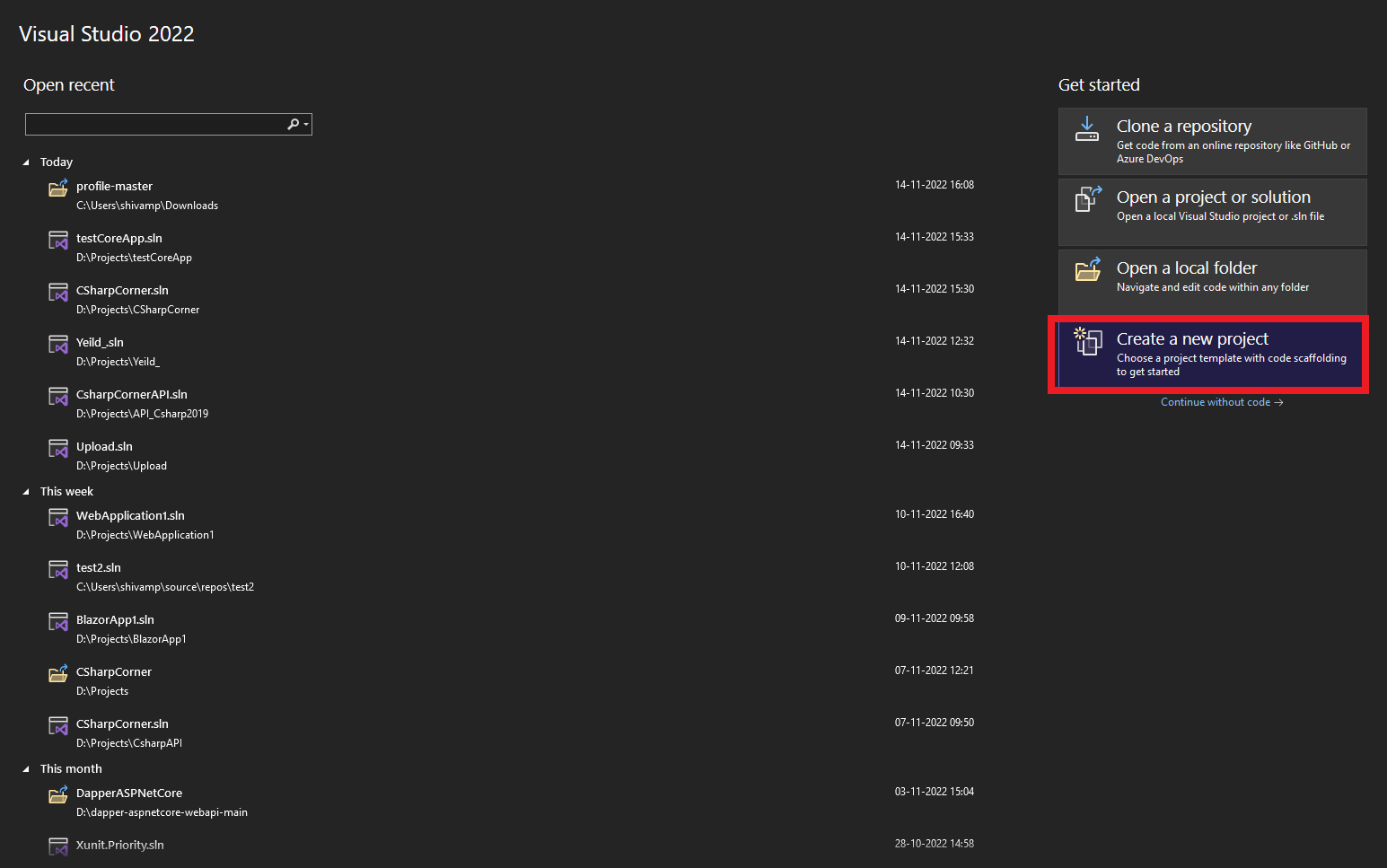 Open visual studio and click on Create new project. Here I am using Visual Studio 2022 with .Net 6 which is the latest version of visual studio.