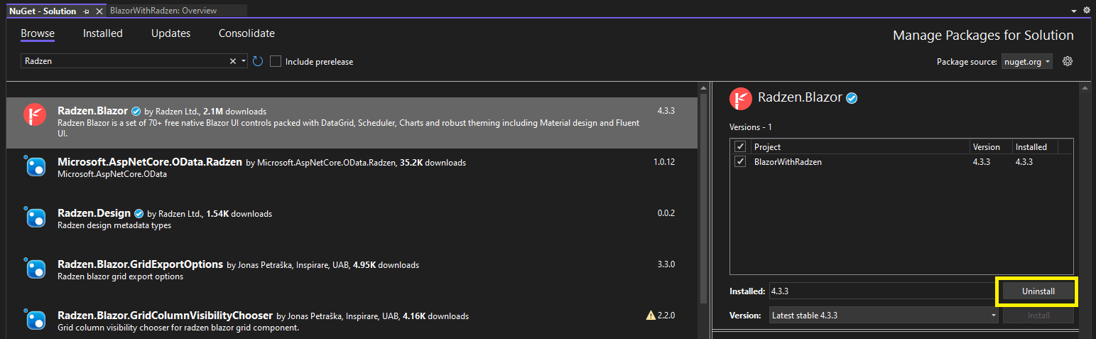 Now simply click on the ok button and if you don't want to see this alert next time you can also check the check box "Do not show it again". Now you can see that we are getting the option to uninstall the Radzen.Blazor means it's installed in our project or solution.