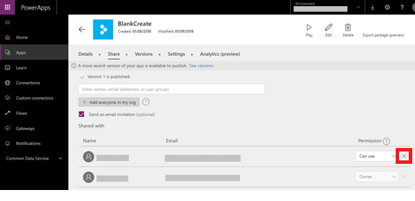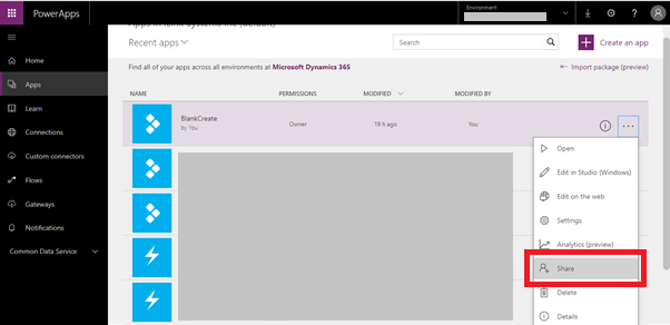 - You can share an app from powerapps.com but not from PowerApps Studio. (Click or tap the Share icon in PowerApps Studio to open powerapps.com).