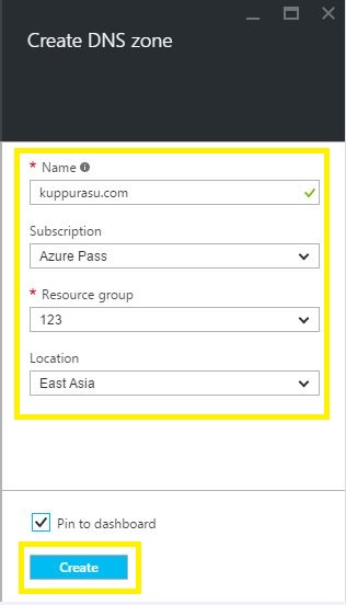 In the DNS zone account blade, specify the desired configuration for the DNS zone account (Name: For example, contoso.com & Resource Group). Click Create button at the bottom of the screen to create the DNS zone.