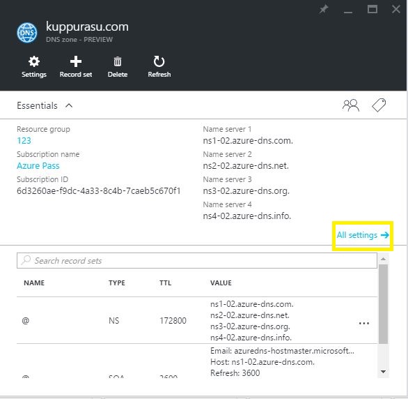 In the DNS zone blade, click on All settings to open the Settings blade for the DNS zone then the lower part of the Essentials pane, you can see the record sets for the DNS zone.