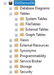 For this demo project, I have created a separate Database named SSISDemoDb, which currently has no tables.