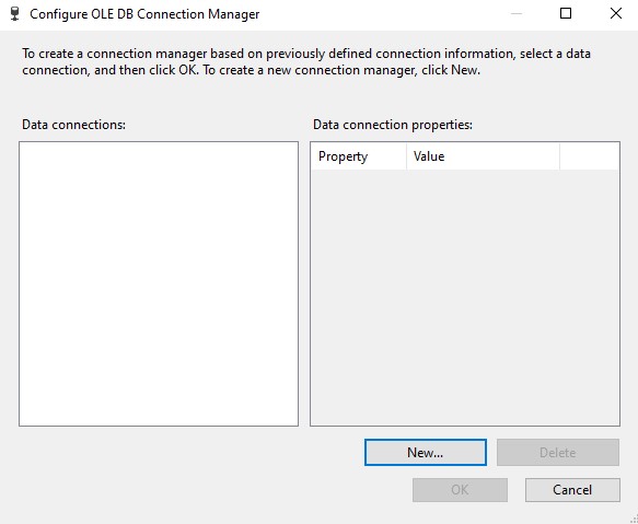 A new Configure OLE DB Connection Manager Window will open. If you have already created the connection, skip this, else Create the 'New' button.