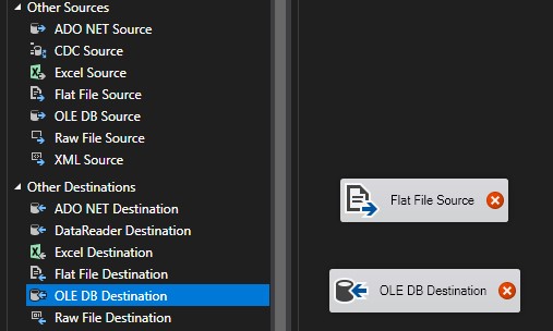 Double-click the dragged Data Flow Task, and add a flat file source and OLE DB Destination. Ensure the connection string is proper.