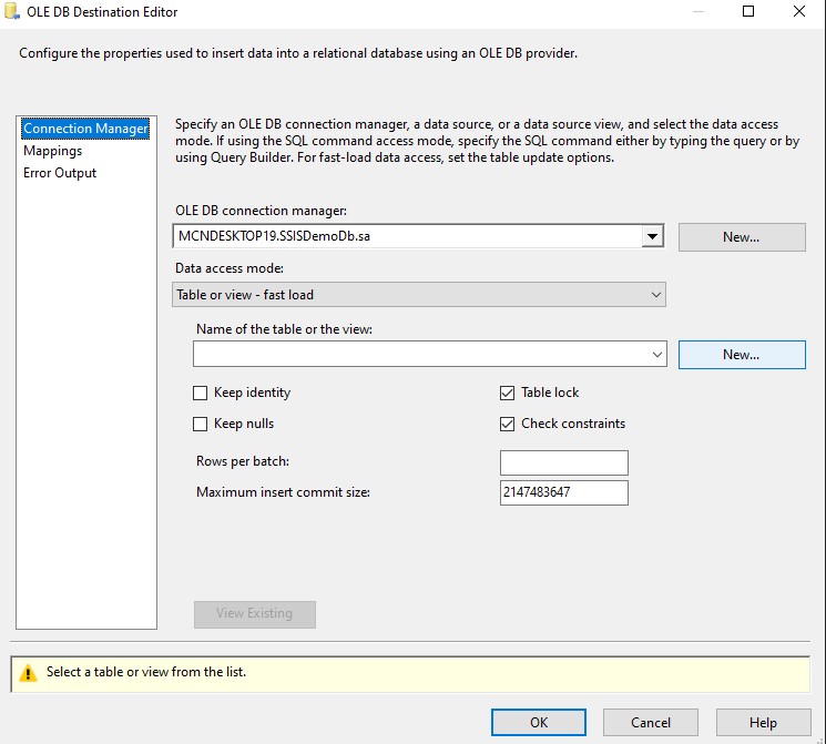 Double-click on OLE DB Destination and an editor window will open. Here, if you already have a table created, then in the name of the table, select the table, else click the 'New' button.