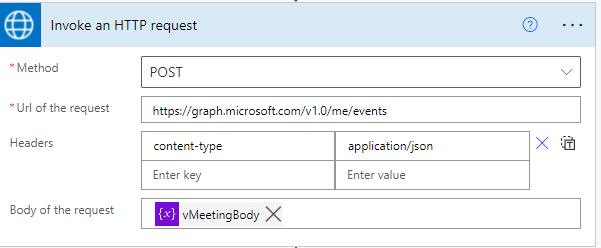 Add URL of the request, Headers, and pass “MeetingBody” for the body of the request.