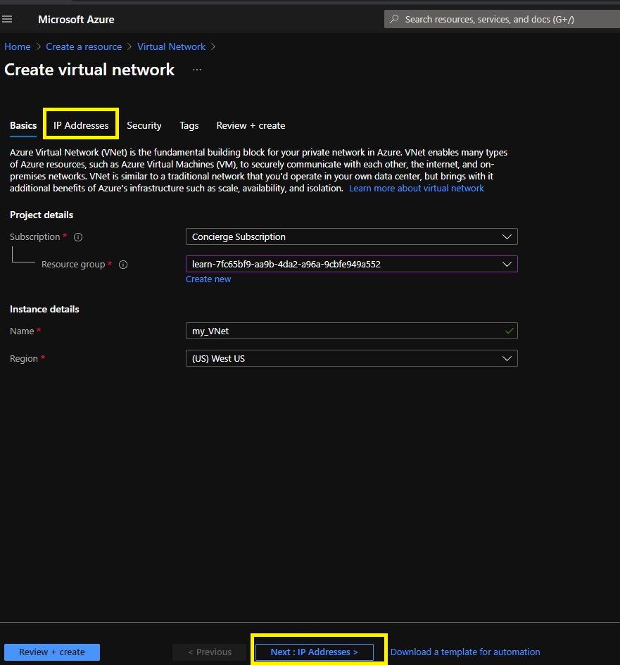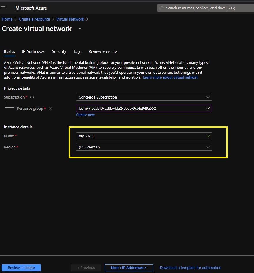 Under the Basics tab, fill in the details for the Subscription and Resource Group you are using. Set the Region to US West with Instance Name: my_VNet.