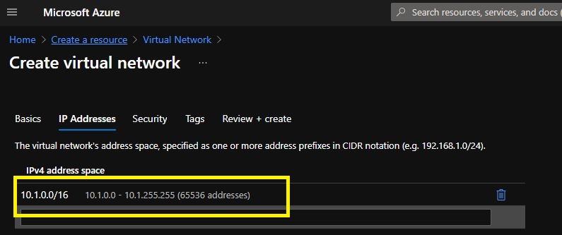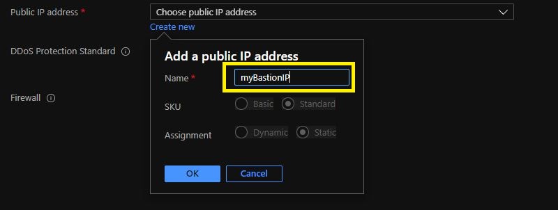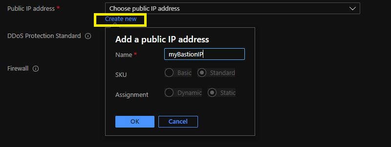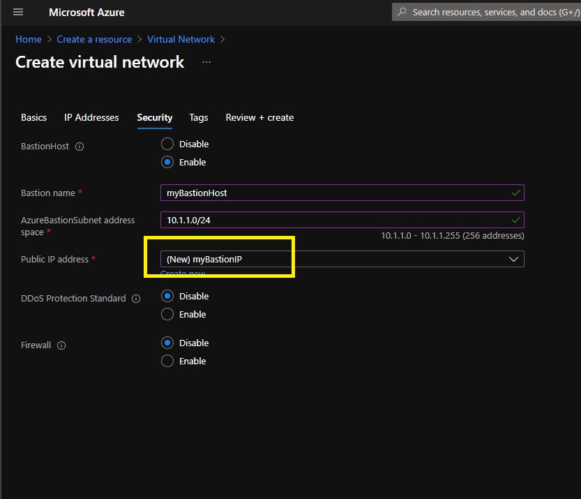 Under the Security, Set the Bastion name as myBastionHost and the Address space for 10.1.1.0/24