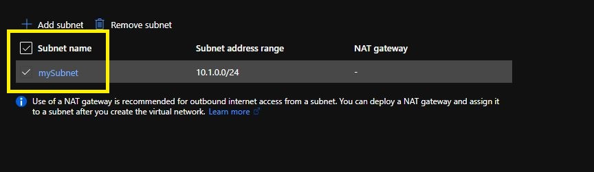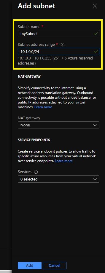 Click on Add Subnet and fill in the details with Subnet Name as mySubnet and Subnet address range set to 10.1.0.0/24.
