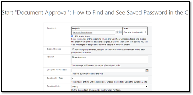Now, click on "Document Approval" as shown below, which will navigate to the page where Workflow is going to start. If any changes are required, you can do that and click on "Start", as shown below.