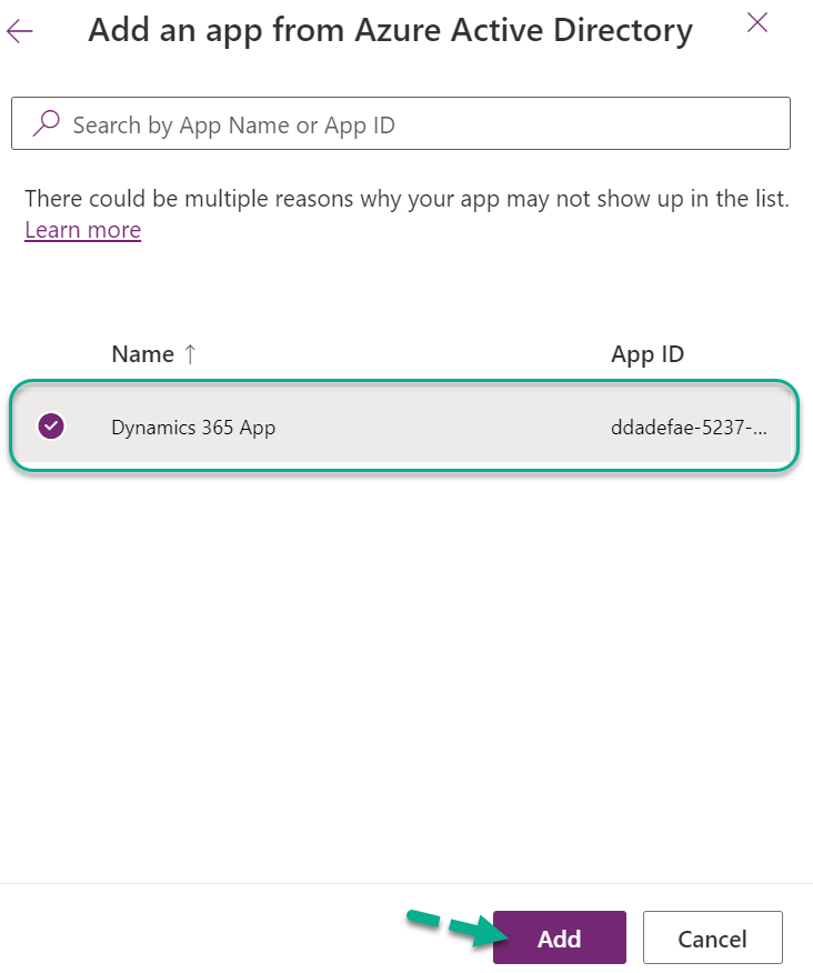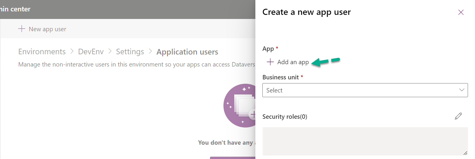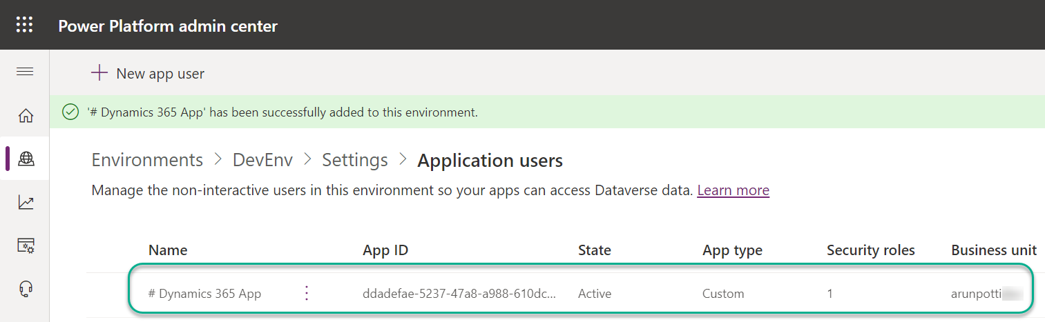 Note: In an environment, you can only have one application user for each Azure AD–registered application.