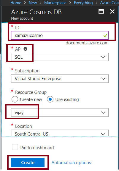 Type the ID, select SQL as API with different options( SQL, Mongo DB, Cassandra, Azure Table, Gremlin(graph) and select the Resource group and Location.