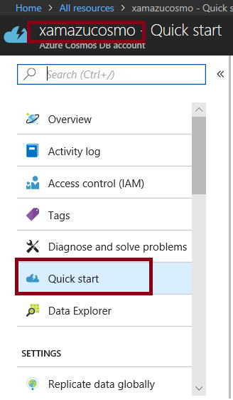 After creating your Cosmos DB account, open the resource and select QuickStart,