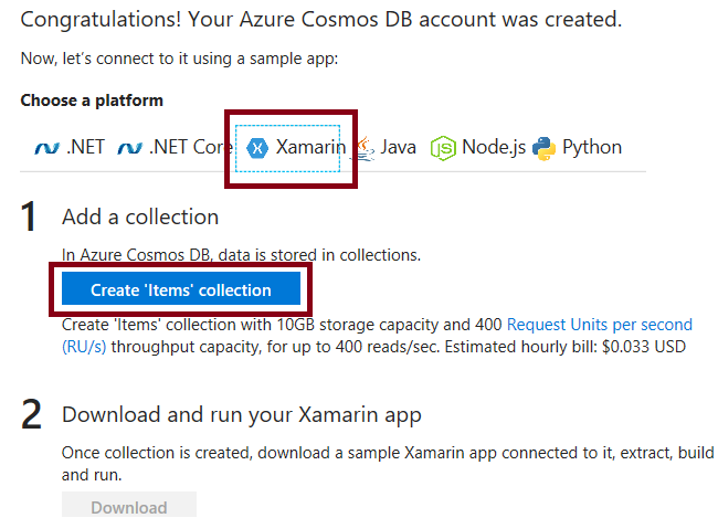 Select the platform as Xamarin and click on Create Items Collection Button. This will create a ToDoList Collection in the database.