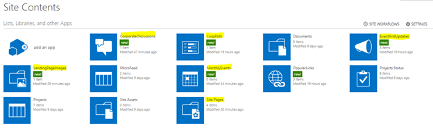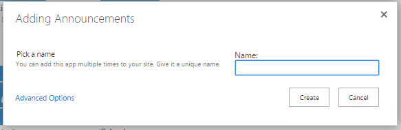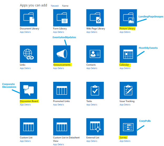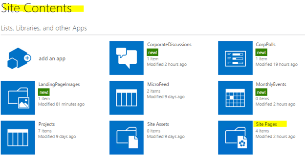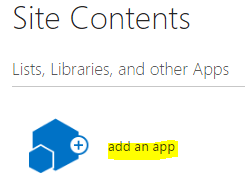 To create a new app, we need to click on "Add an app" icon from "Site Contents".