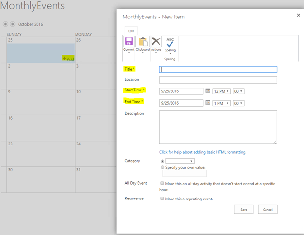 To add Events in Monthly Events calendar, click the "+Add" link and you will see the pop-up form. Fill in the mandatory details and click "Save" button.
