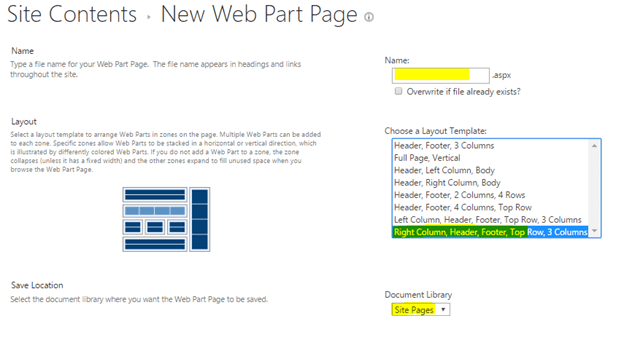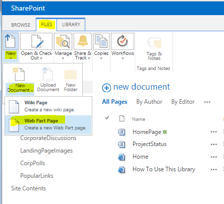 Now, select the "Files" tab from the top ribbon. Select the down arrow >> "New Document". Finally, select the "Web Part Page".