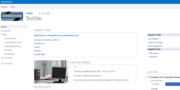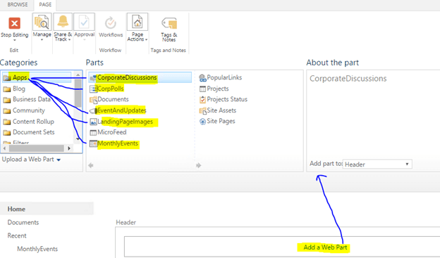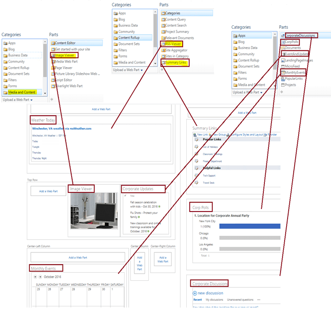 The below home page shows the list of WebParts used.